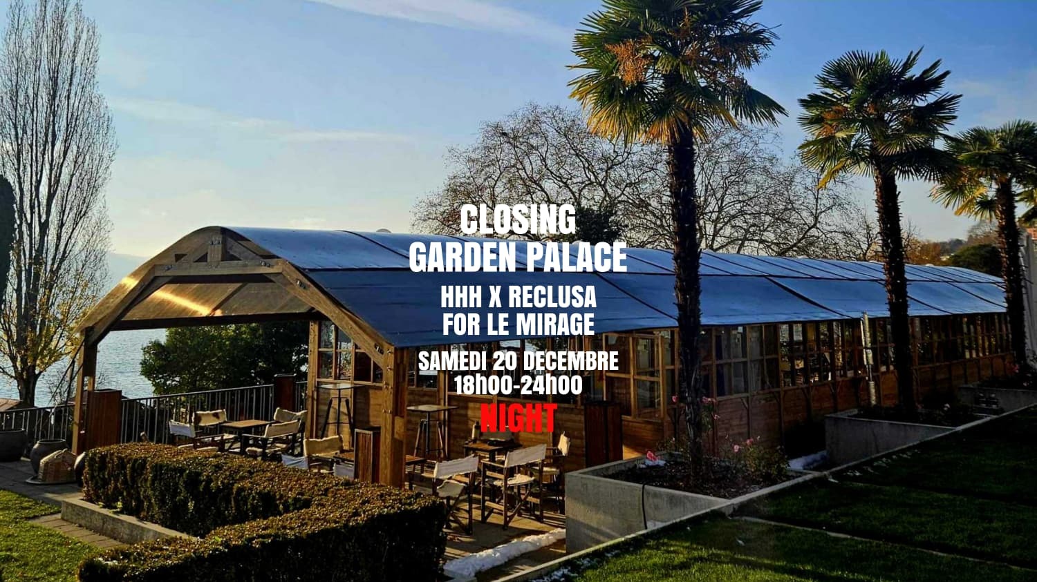 We are pleased to invite you to the Closing of the Montreux Christmas Market festivities, to be celebrated in the enchanting setting of the Garden Palace with DJ RECLUSA FOR LE MIRAGE (6:00–9:00 pm) and DJ HHH (9:00 pm–12:00 am).